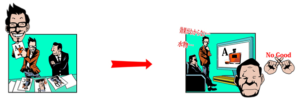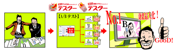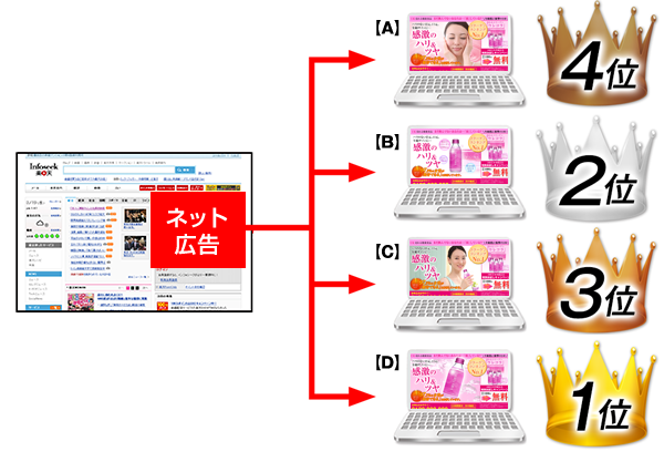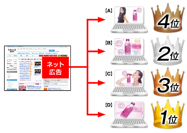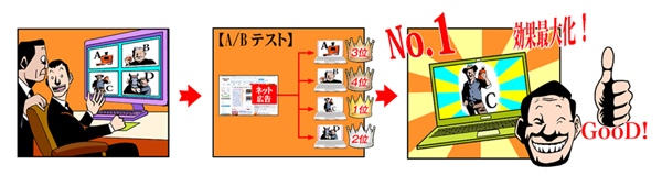 逆に、ネットメディア(オンライン)、つまりはネット広告では、効果測定はもちろん、技術的に【A/Bテスト】が100%正確に実施可能な媒体なので、ネット広告業界では広告キャンペーンの前に複数のパターンの広告クリエイティブを作り、事前に小規模でテストキャンペーンとして【A/Bテスト】を行い、一番効果(レスポンス)が高い"1位"の広告クリエイティブを選定(判断)し、その"1位"の広告クリエイティブを使い本番の広告キャンペーンを行うことにより、広告キャンペーンの効果を100%確実に"最大化"してきました。つまりは広告クリエイティブがお客様(消費者)により統計学的に選定(判断)されることが当たり前になっています。 ![]() ▲ネット広告業界では、事前に【A/Bテスト】で選定した一番効果が高いクリエイティブを使うため効果が