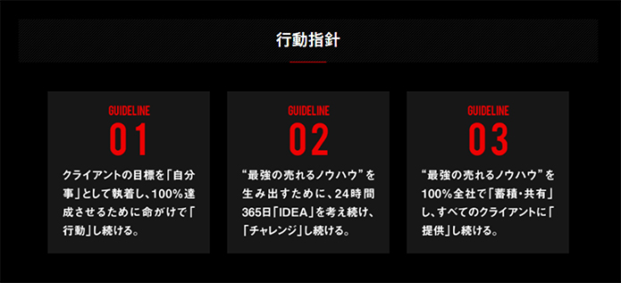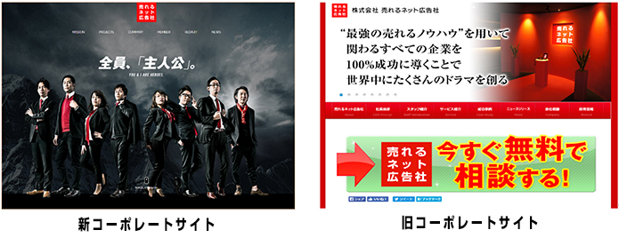 株式会社 売れるネット広告社 ![]() ★売れるネット広告社 創立7周年記念★ 抜本的にコーポレートサイトリニューアルしました! 〜新テーマは『世界中にたくさんのドラマを創る』〜 本日、売れるネット広告社は会社創立7周年を記念して、コーポレートサイトを大々的にリニューアルしたことを発表いたします。社員一人ひとりを「主人公」として位置づけ、売れるネット広告社が新たに設計した“企業理念”“行動指針”を世の中に発信するコンテンツとなっております。2010年に会社を創立して以降、抜本的コーポレートサイトのリニューアルは今回が初めてとなります。 リニューアルオープンしたコーポレートサイトのメインテーマは、企業理念のキーワードともなっている『世界中にドラマを創る』です。小さなワンルームマンションでたった二人から始まった『売れるネット広告社』はこの7年間で、少しずつ仲間が増えていき、オフィスも少しずつ広くなり、東京支社もつくり、少しずつ“成長”を重ねてきました。 社員全員が、「主人公」であること、そして、企業理念と行動指針を合言葉とし、命がけでクライアントの成績にコミットするという執着心と熱い心を発信するために、今回創立7周年というタイミングでコーポレートサイトの抜本的リニューアルを行うに至りました。 そうした想いから、従来のコーポレートサイトとは打って変わって、売れるネット広告社代表“加藤公一レオのブランド”だけでなく、“社員一人ひとりのブランド”を大きく打ち出しております。 ■トップページ 全体が真っ赤な旧コーポレートサイトから、赤がポイントで目立つ黒を基調としたクールなイメージへ ![]() ■企業理念 ![]() ■行動指針 ![]() ■スタッフ紹介 プロのカメラマンによる撮影で、社員紹介ページも充実させました。 ![]() http://www.ureru.co.jp 社員一同、新たに掲げた企業理念と行動指針の実現に日々精進して参りますので、今後とも、売れるネット広告社をどうぞ宜しくお願いいたします。 ◆ ◇ ◆ 【株式会社 売れるネット広告社 会社概要】